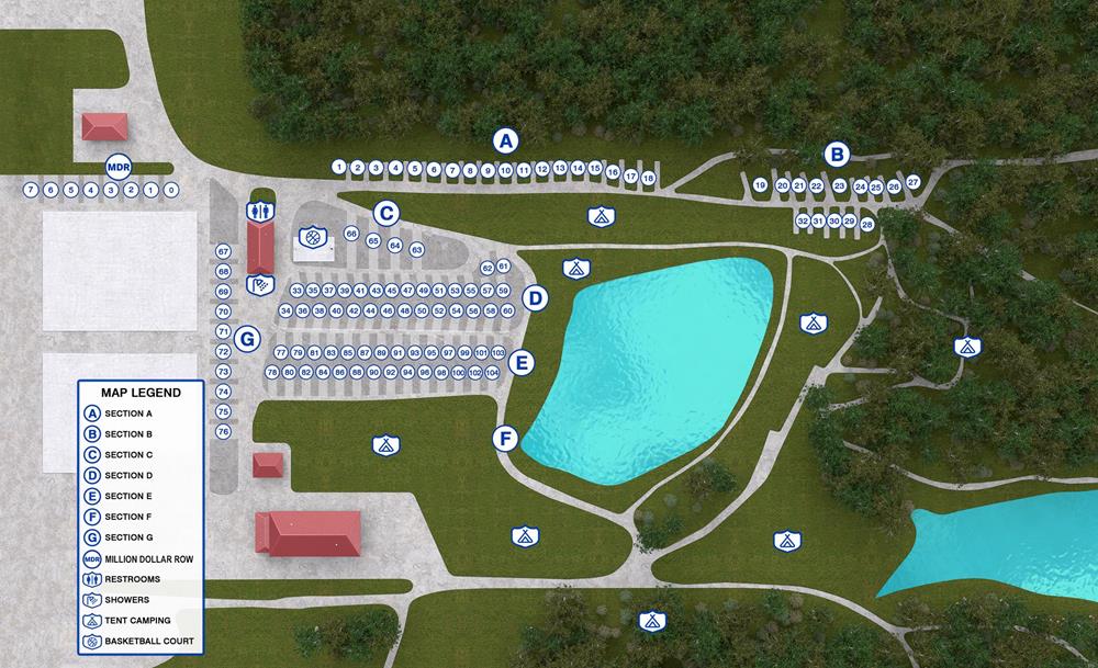 There are 74 RV spots available with power and water, 5 spots with power only and 25 Reserve Dry spots for each event as well as many acres of open dry camping for both RV and Tent Camping. On Lake Lucas there are 38 RV spots on the south side of the track. It is a great way to catch all of the racing action from the comfort of your RV. Call (417) 295-6043 for reservations.