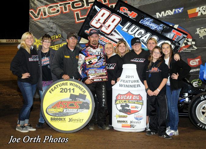 Lonnie Wheatley, WHEATLAND, Mo. (September 23, 2011) – Tim Crawley of Benton, AR, has taken an apparent liking to Lucas Oil Speedway as he broke into Lucas Oil ASCS presented by K&N Filters National victory lane for the first time this season in Friday night’s 25-lap Jesse Hockett / Daniel McMillin Memorial preliminary feature event.