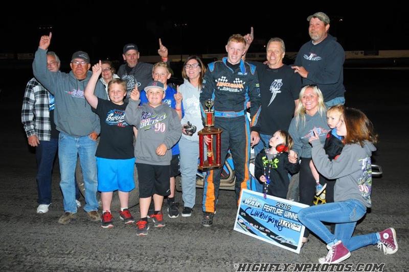 For the first time this season, Boyles was starting outside the front three rows, in tenth. With just 25 laps for the feature event, he’d have to rally around the big half-mile oval in a hurry. He wasted no time in doing so, attaining the sixth position on lap five, using the high line to his advantage. An extended battle for the fifth position broke out by the ninth circuit; two well-timed Boyles slidejob attempts entering turn one were successful to take fifth on lap 12 and then the fourth spot two laps later. Soon, Boyles again used the top side of the speedway in the third turn to maneuver past former WAR champ Mitchell Moore into third place, but a car flipping down the front straightaway negated the move. Nonetheless, an identical tactic worked on the restart, and the duo battled for the next two laps before Boyles took the spot for good. The spectacular run continued for the breakout star, with another slider to move into second with six to go. Leader Terry Babb, a winner already this year in WAR action, looked to be in reach, but soon started to pull away. Luckily for Boyles, a car flipping through turn three brought out a red flag with four laps remaining. On the restart, Boyles hung tight with the leader, eventually attempting a slidejob on lap 22. Though the move was unsuccessful, he suspected something was amiss with the leader’s rear axle, and was proved right in the next corner, as the axle broke and sent Babb into the turn two wall. Boyles inherited the lead, and the subsequent caution and restart was fruitless for all challengers, as he led the final three laps en route to the victory. “We were worried that our 360 wouldn’t be able to keep up with some of the 410s here on this big track. We were wrong,” Boyles admitted. “Tim Rowden gives us a great engine package and it got the job done tonight.”