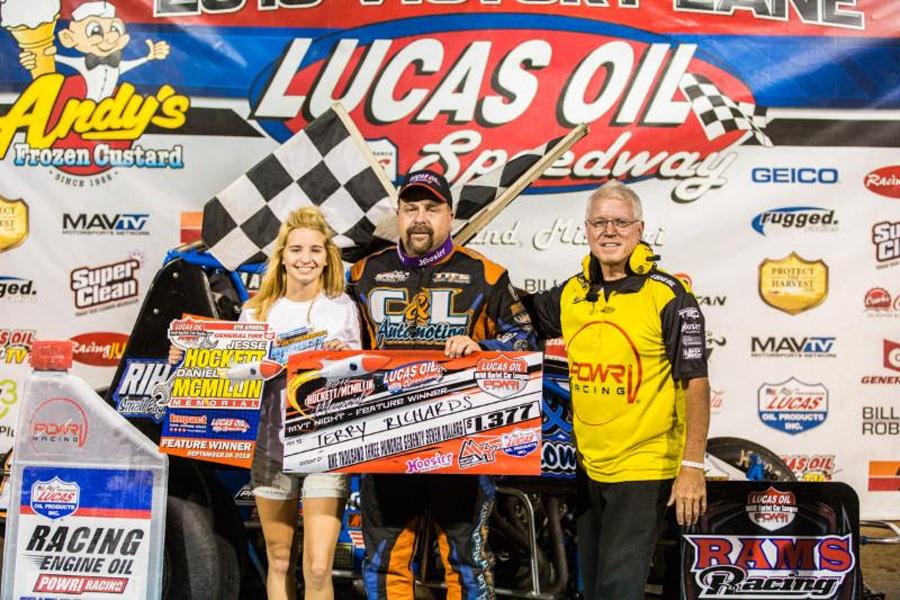 In the end, Denton, Nebraska's Terry Richards led 23 of 25 laps, battled a relentless Thomas Meseraull and fended off a hard-charging Kyle Clark, as Richards scored the win in Thursday's Mesilla Valley Transportation night at the Jesse Hockett/Daniel McMillin Memorial, which also marked his first-career victory with the POWRi Lucas Oil WAR Sprints League.