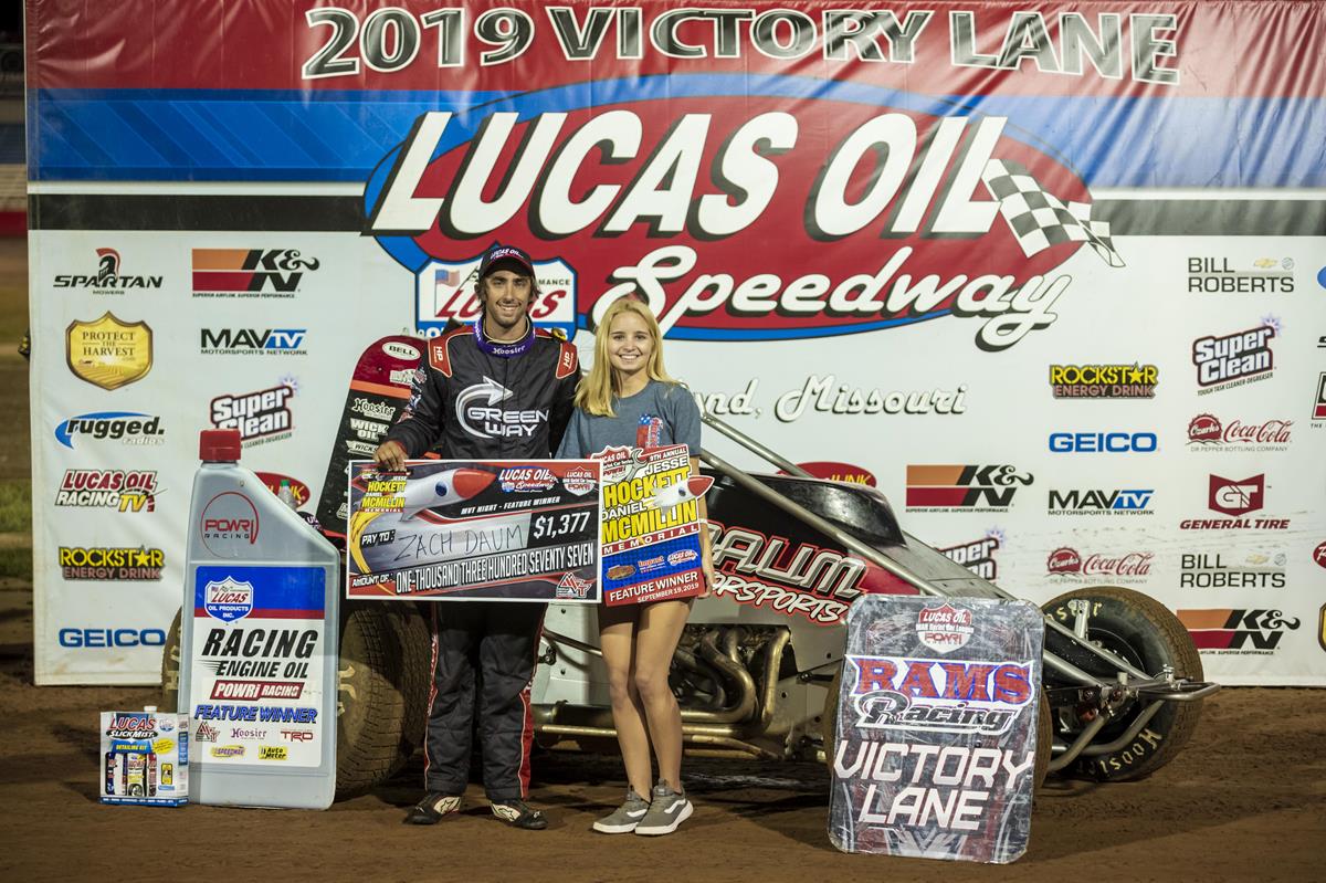 WHEATLAND, MO. (September 19, 2019) – The ninth annual Jesse Hockett / Daniel McMillin Memorial opened with a bang in Thursday’s Mesilla Valley Transportation preliminary as Zach Daum of Pocahontas, Ill. glided to the race lead on lap 17 and held on for his sixth-career POWRi Lucas Oil WAR Sprint League victory.