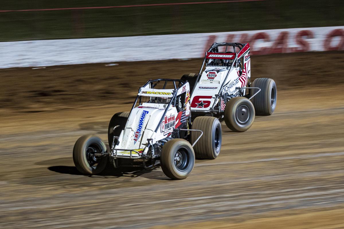 WHEATLAND, MO. (September 20, 2019) – Fans at Lucas Oil Speedway played witness to an instant classic in Friday’s Rockwell Security preliminary program. The 25-lap POWRi Lucas Oil WAR Sprint League feature offered a handful of lead changes, side-by-side racing through the pack, and a race-deciding move in the closing laps. Ultimately, it was Brady Bacon capping a perfect night as he pounced on Mario Clouser on lap 23 and survived for an epic win on night two of the ninth annual Jesse Hockett / Daniel McMillin Memorial.