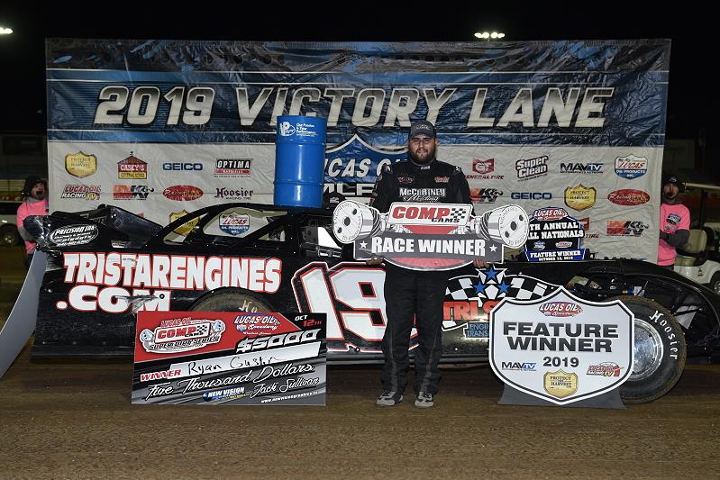 Wheatland, Missouri (10/12/19) – Overcoming being collected in a lap-1, multi-car tangle, 10th-starting Ryan Gustin of Marshalltown Iowa stormed to his first-career COMP Cams Super Dirt Series presented by Lucas Oil win on Saturday night at the state-of-the-art confines of Lucas Oil Speedway.