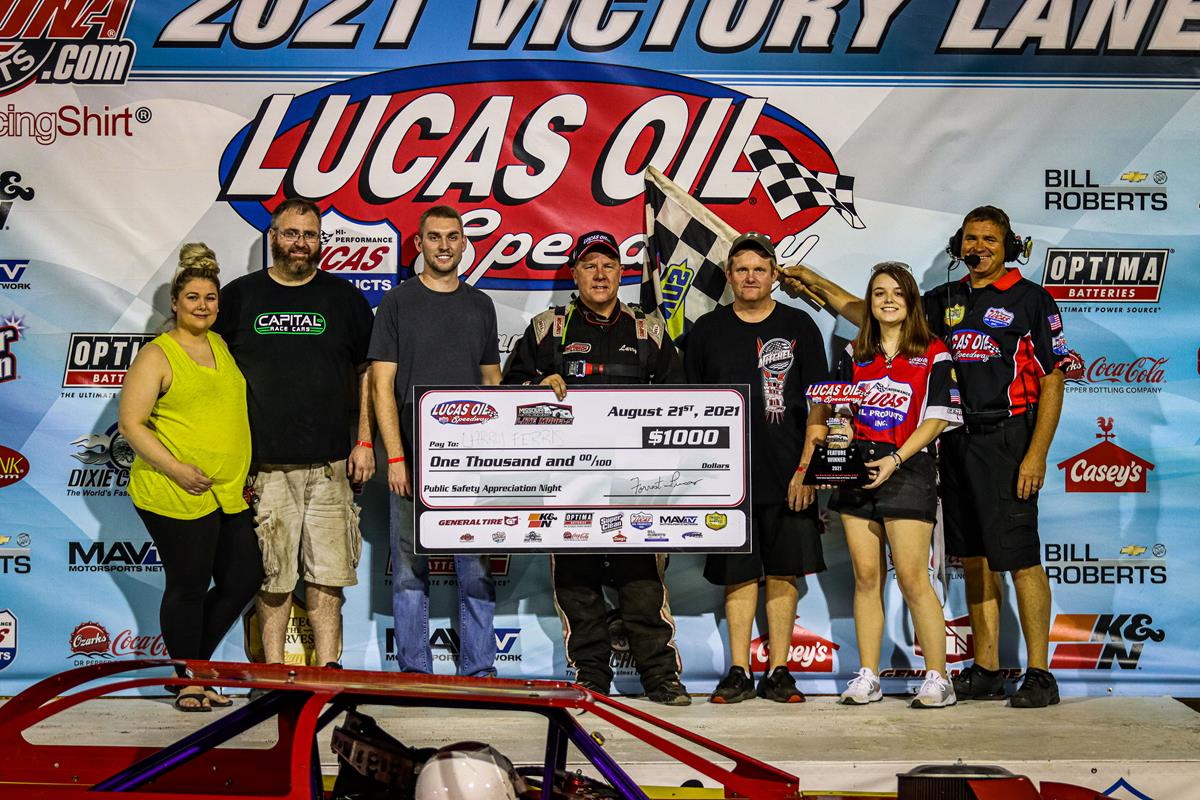 WHEATLAND, MO. (Aug. 21, 2021) - Larry Ferris put an end to Johnny Fennewald’s five-race winning streak in the ULMA Late Model division, leading all 25 laps of Saturday night’s headline feature at Lucas Oil Speedway.